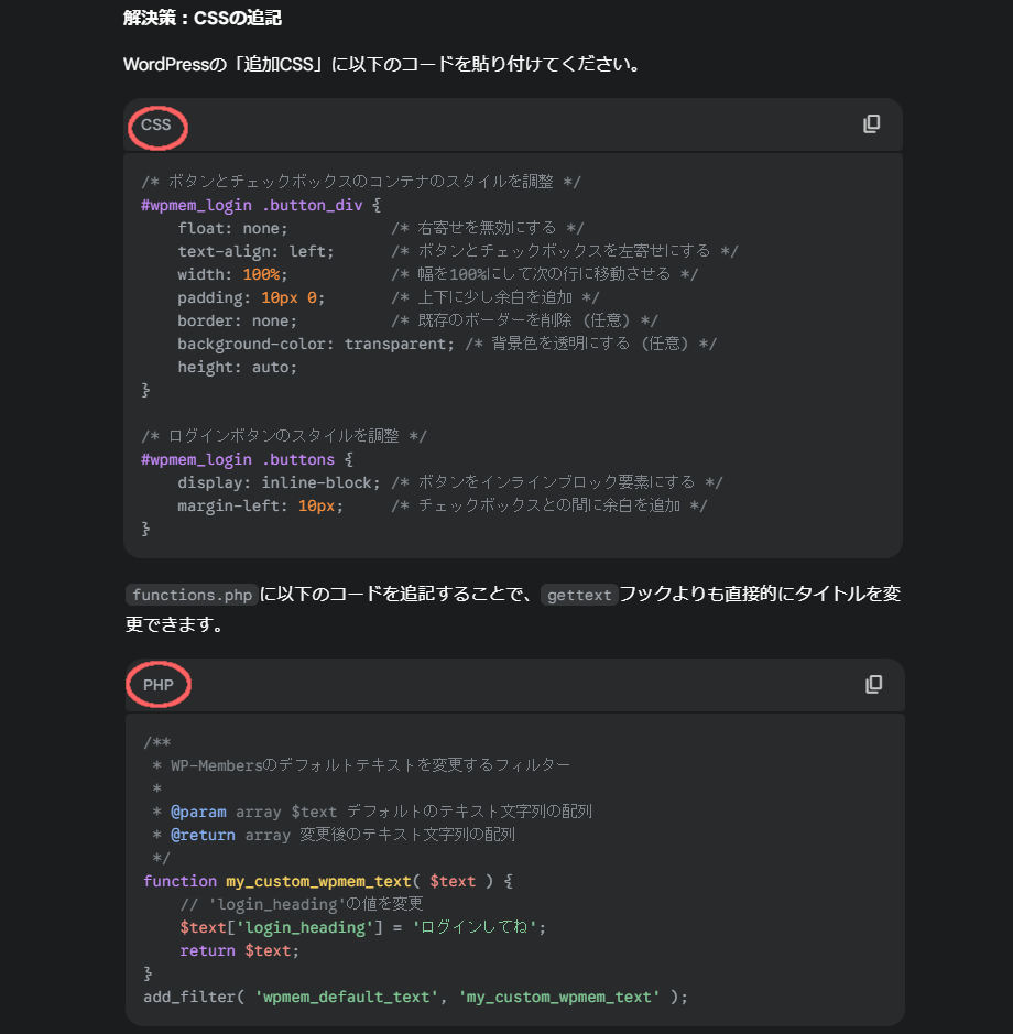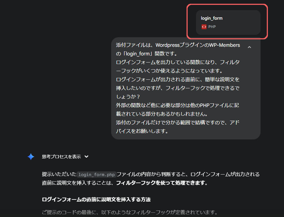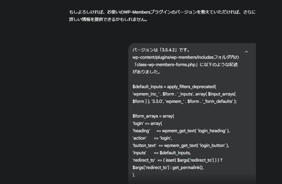 「class-wp-members-forms.php」というファイルに書かれているオリジナルの関数からフィルターフックができそうだと分かり、その部分のコードを丸々コピーしてAIに伝えているわけです。