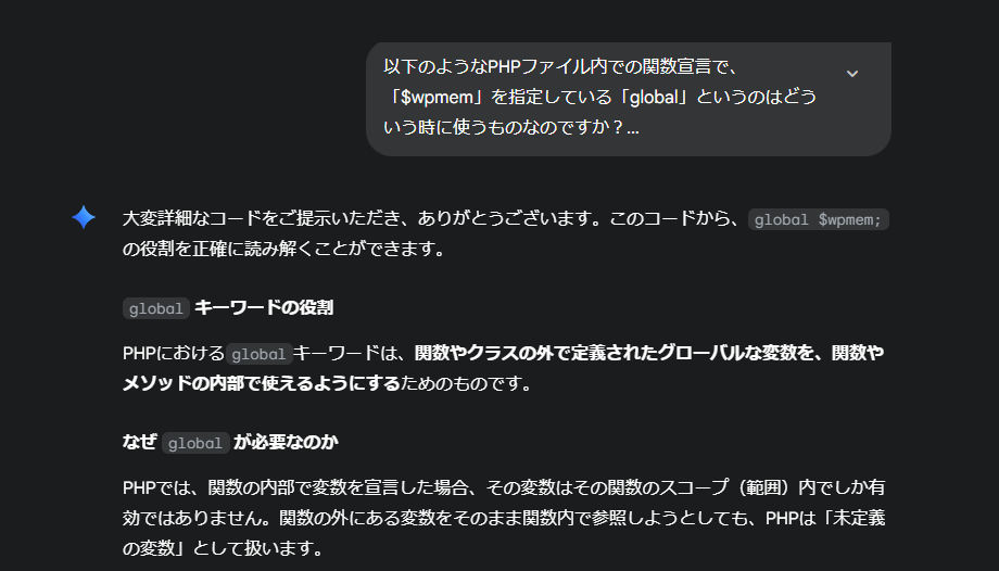 コード内の「global」がよく分からず質問すると、詳細に説明してくれました。