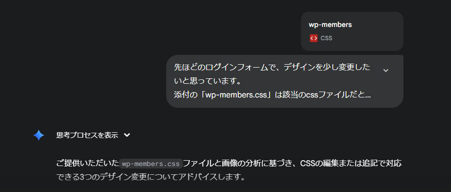 これまでAIに見せてきたPHPのコードをAIが覚えていますし、さらに現在までのやり取りで画面がどのような構成となったかをスクショで画像添付し、オリジナルのCSSファイルも添付してあげれば、デザイン面についても詳細なアドバイスをくれます。