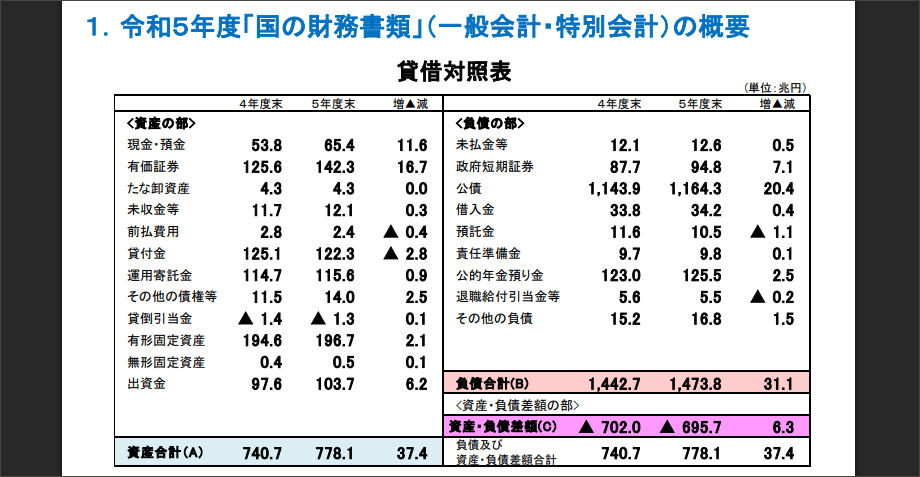 最新版(令和5年度決算・令和7年1月頃公表分)の「貸借対照表(バランスシート)」の項目を確認してみましょう。