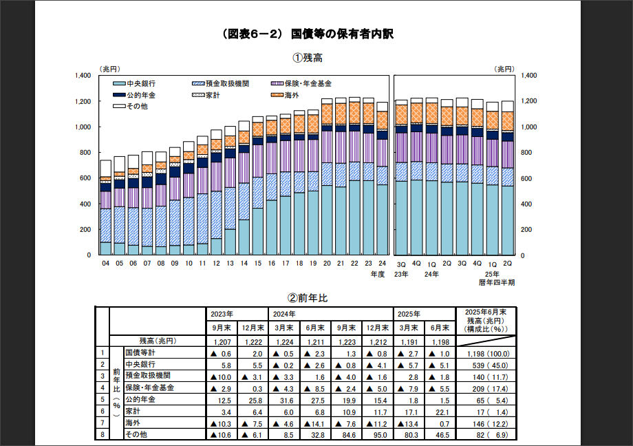 令和7年第2四半期(速報)の資金循環から「国債の保有者別内訳」を探してみると、中央銀行が載っていますね。