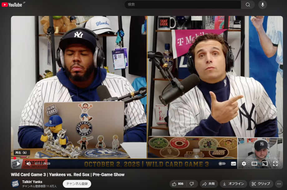 ジョーズ氏は「talkin' Yanks」の関連コンテンツに頻繁にゲスト出演しているので、こちらでは現在のポストシーズンすべての試合時間において応援をしている様子が閲覧できると思います。